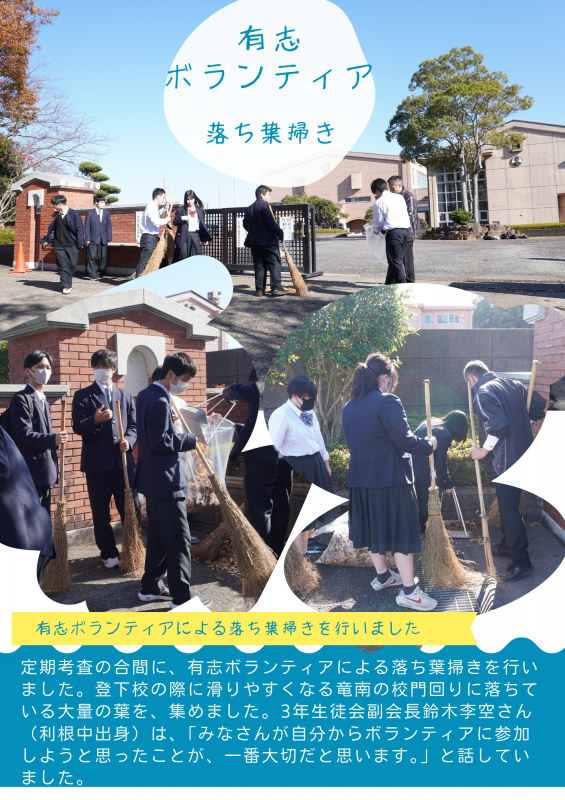2025/11/17 【有志ボランティアによる落ち葉掃き】 お知らせ 11/19 ブログ 2025/11/14 【竜南交流会を開催しました】 お知らせ 11/14 ブログ 2025/11/12 【通級説明会】 お知らせ 11/12 ブログ 2025/11/06 【赤ちゃんふれあいセミナー】 高校生のライフデザイ... お知らせ 11/07 ブログ 2025/10/30 【高校生のライフデザインセミナー第1弾】 お知らせ 11/06 ブログ 2025/10/27 【リサイクルトレー洗浄】 お知らせ 11/06 ブログ 2025/10/24・25 【翔南祭開催しました。】 第40回翔南祭を無事... お知らせ 11/04 ブログ 2025/10/21 【翔南祭準備中です】 お知らせ 10/23 ブログ 2025/10/20 【校内にて献血を行いました】 お知らせ 10/23 ブログ 2025/10/17 【2学年 性に関する講演会】 お知らせ 10/21 ブログ {{item.Topic.display_title}} {{item.Topic.display_publish_start}} {{item.RoomsLanguage.display_name}} もっと見る